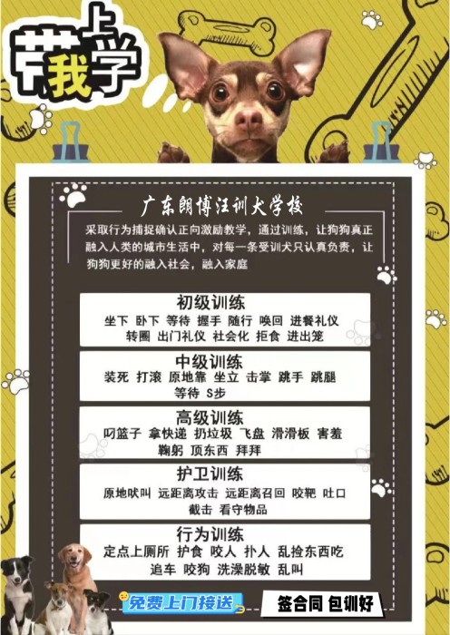 广东省内专车免费接送/专业训犬团队/星级训练及住宿环境/终身免费复训及指导